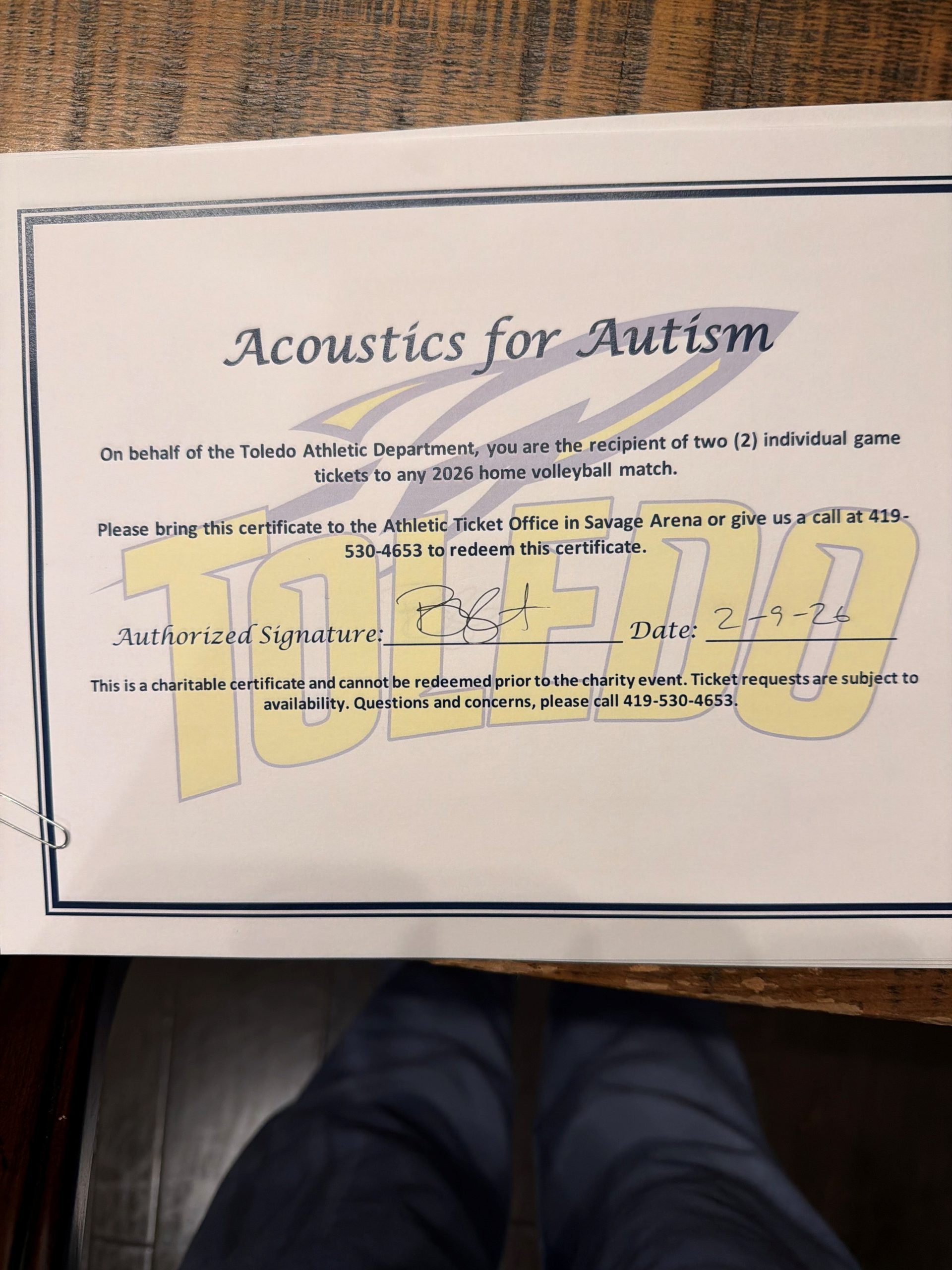 Five certificates, each valid for two tickets to any 2026 University of Toledo home Volleyball game.