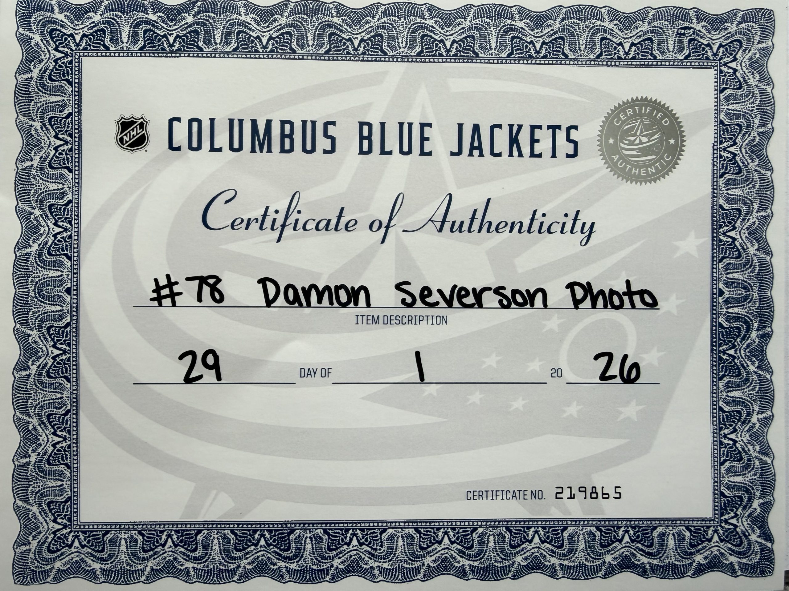 Autographed picture of #78 Damon Severson of the Columbus Blue Jackets